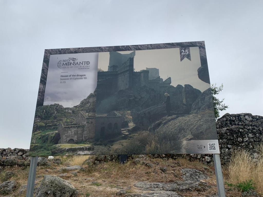 Caminhamos pela aldeia inteira e subimos até as ruinas do castelo, onde ocorreram as filmagens, num caminho assinalado por cartazes do trabalho com indicação do momento em que as cenas aparecem no episódio 10 da temporada 1.